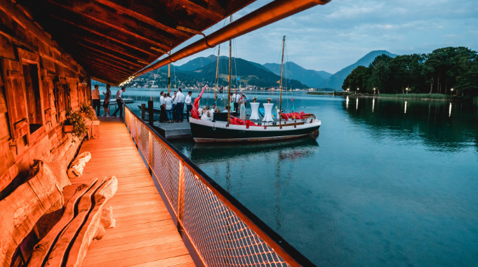 Blick auf Berge, See und euch beide: das Bootshaus Tegernsee