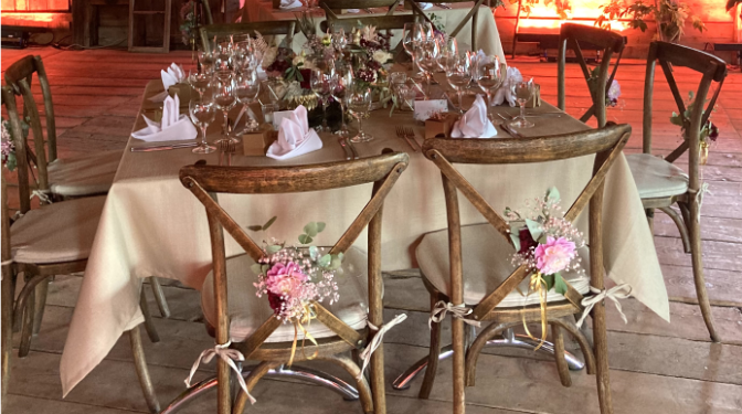Wenn ihr möchtet, könnt ihr eure Dekoration auch selbst mitbringen und wir bauen diese für euch auf. Wichtig dabei ist, dass mitgebrachte Dekorationen gut vorbereitet werden, also beispielsweise kistenweise verpackt und direkt einsatzbereit ist oder Gastgeschenke tischweise vorsortiert sind.